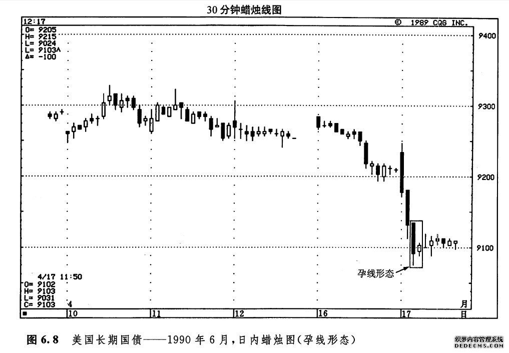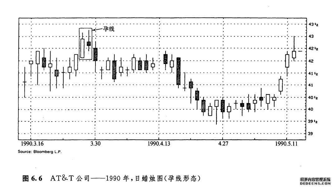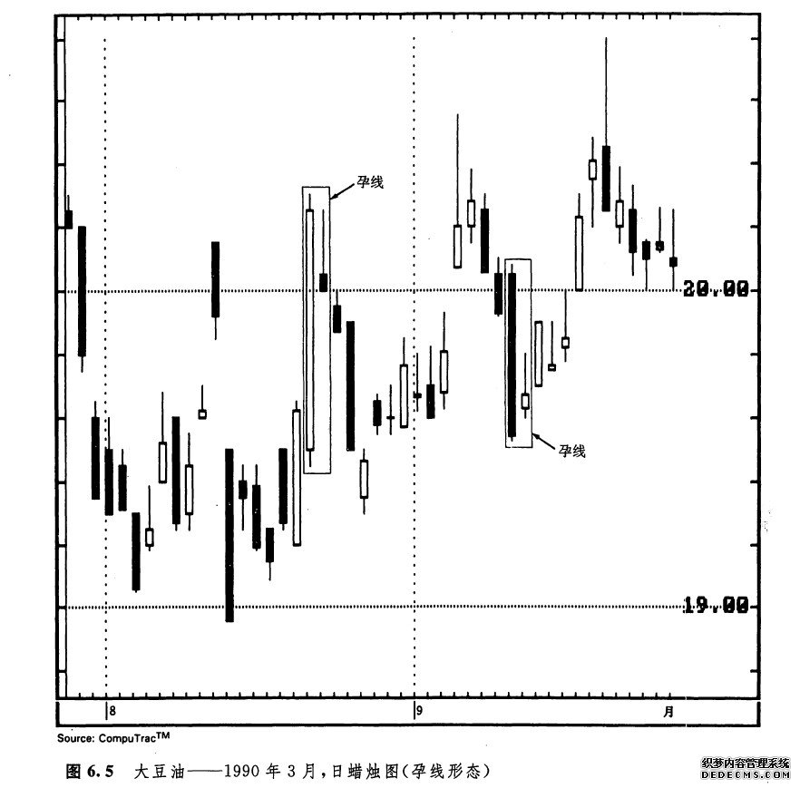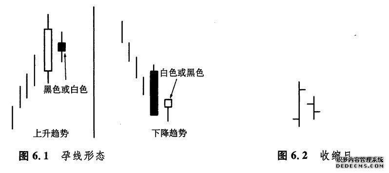 如图6.1所示即孕线形态,其中后一根蜡烛线的实体较小,并且被前一根相对较长的实体包容进去。本形态的名字来自一个古老的日本名词,意思就是“怀孕”。在本形态中,长的蜡烛线是“母”蜡烛线,而小的蜡烛线则是“子”或“胎”蜡烛线。在第三章,我们曾交代过,纺锤线(即具有小实体的蜡烛线)在某些形态中很有用处。孕线形态就是这些形态的一个例子(星线也是一个例子,这在第五章已有探讨)。孕线形态与吞没形态相比,两根蜡烛线的顺序恰好颠倒过来。