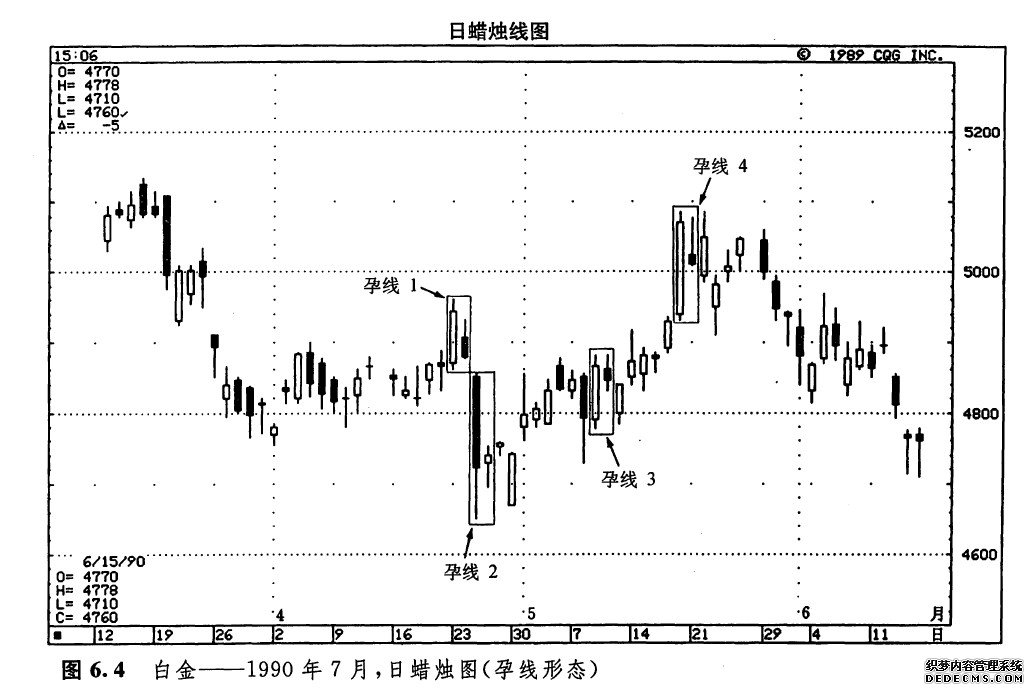 如图6.4所示,从4月18日开始,有一段小规模的上涨行情。孕线形态1结束了这段行情。从孕线形态1开始,市场形成了一轮抛售行情,孕线形态2又阻止了这轮下跌过程。孕线形态3表明,即使在孕线形态出现前市场并无明显的趋势,孕线形态也可能具有一定的参考价值。请注意,5月的头几天,市场并无明显的趋势可循。就在这个时候,孕线形态3出现了。它的第一天是一根长长的白色实体,第二天是一根小小的黑色实体(请记住,第二天实体的颜色是无关宏旨的)。