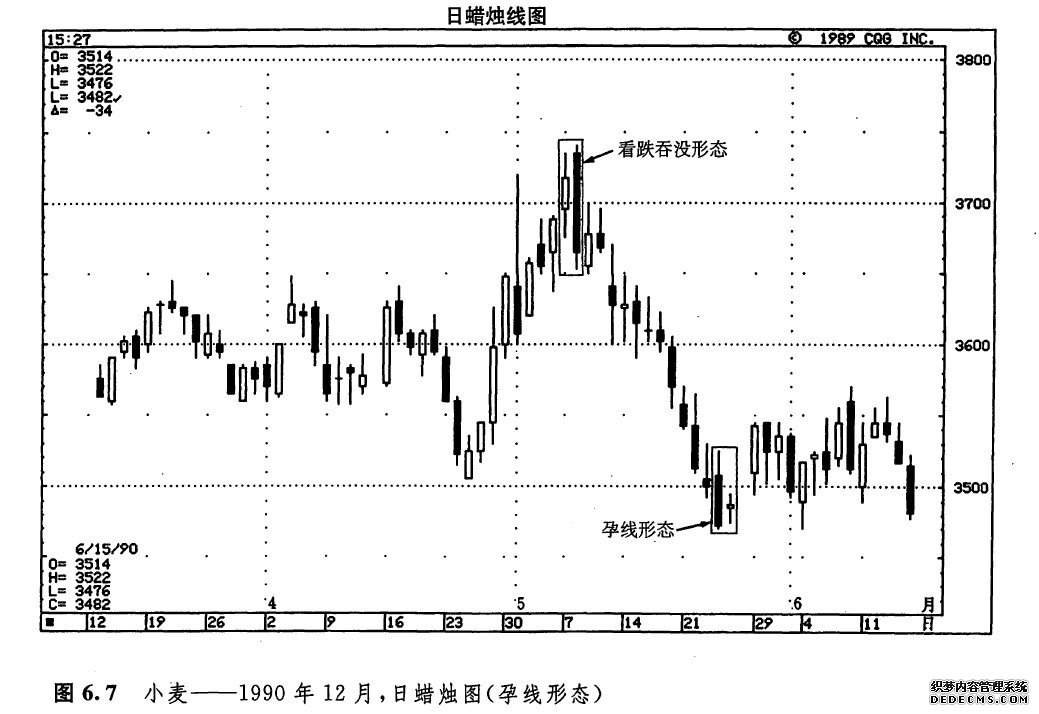 如图6.6所示,3月下旬出现了一个二蜡烛线的孕线形态,请看它是如何标志着市场顶部的到来的。随后形成的抛售行情一直持续到4月24日的看涨锤子线为止。请注意,在这个孕线形态中,第二天的影线已经超出了第一天实体的范围。这一实例证明,在孕线形态中,两个实体的相对大小是至关重要的,而它们的影线的相互关系,则无须深究。