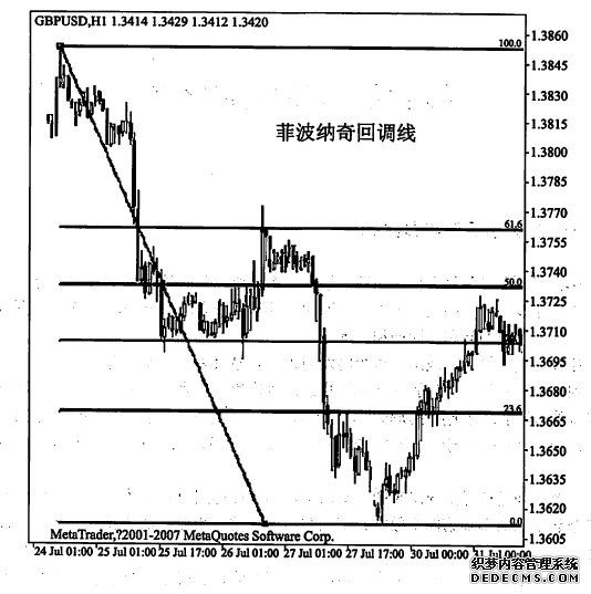 在我们的交易中将大量使用菲波纳奇比率,所以你必须认真学习它,把它当宝贝看待。菲波纳奇比率是一个庞大的课题,并且对于它的研究分门别类,但我们主要研究两个方面紐问题:回调和扩展。
