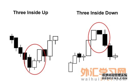 内侧三向上模式是在一个下跌趋势的底部形成的趋势逆转模式。这表明下跌趋势可能结束,而且一个新的上升趋势已经开始。一个有效的内侧三上烛台的形成,有这些属性: