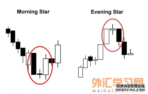 晨星和夜星是你在一个趋势的结束时经常可以发现的三烛台模式。他们可以通过逆转这三个特点被辨别: