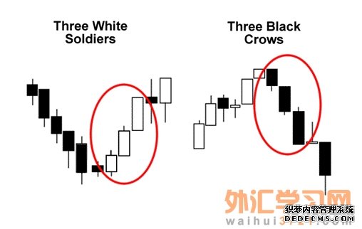 三个黑乌鸦烛台模式仅仅与三个白士兵模式相反。它由三个看跌蜡烛构成,并遵循一个强劲的升势,表明在逆转。