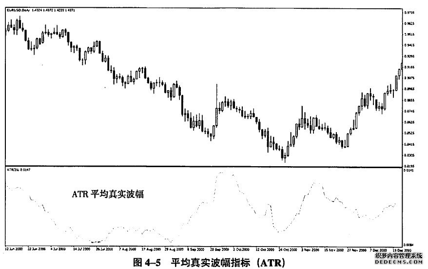 很多趋势跟踪交易者都利用各种方式来规避日内杂波对交易的干扰,他们一般会利用ATR(图4-5)来确定最小的止损幅度,比如理查德·丹尼斯的海龟交易法就运用了这一原则,他将日均波动幅度作为初始止损和跟进止损的标准。