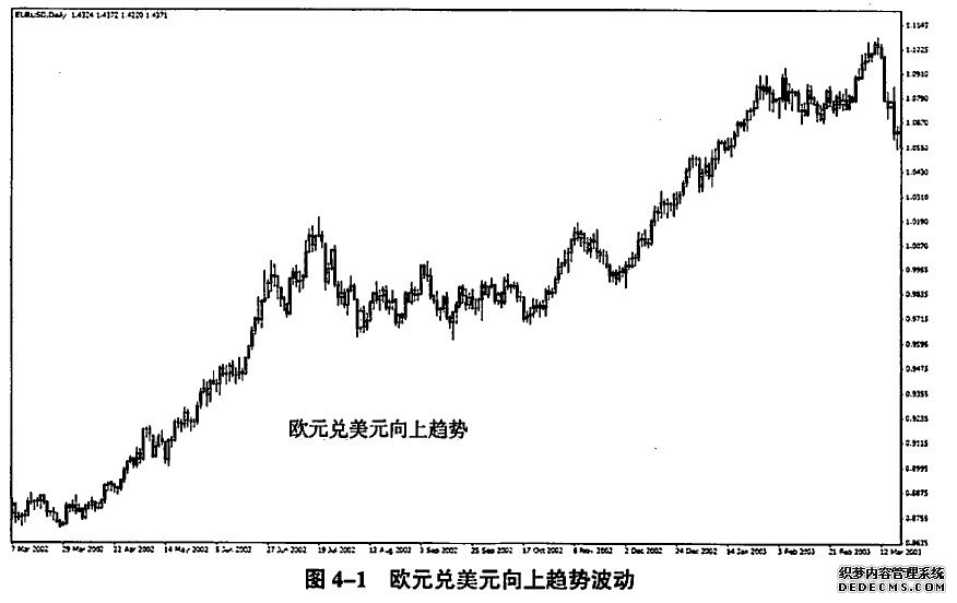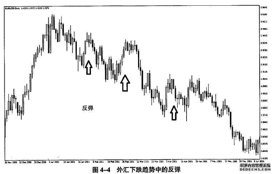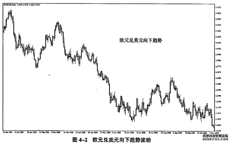 那么,三重市场结构如何区分呢?第一重是主要趋势波动。主要趋势波动分为两种情况:向上趋势波动(图4-1)和向下趋势波动(图4-2)。在股票市场中牛市或者熊市的同向大波动就属于这种类型,在外汇市场中则是持续十几日的单边波动。同向主赛趋势波动之间间隔着次级折返,也就是第二重结构。