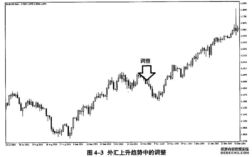 次级折返波动也分为两种情况:第一种称为调整(图4-3),第二种称为反弹(图4-4)。次级折返持续的时间和幅度一直是道氏理论家们关注的重点。次级折返提供了潜在进出场的位置,这点很重要,虽然道氏理论对于进、出场点没有非常明确的定义,但是从该理论最近的发展可以发现,其实道氏理论的进、出场点基本上是依靠次级折返和主要趋势波动的临界点来确定的。我们需要强调的一点是,无论是趋势波动还是次级折返,其基本的构成都是日内杂波,也就是说,其实市场是两个层面,趋势波动和次级折返是同一个层面,而日内杂波是下一个层面。