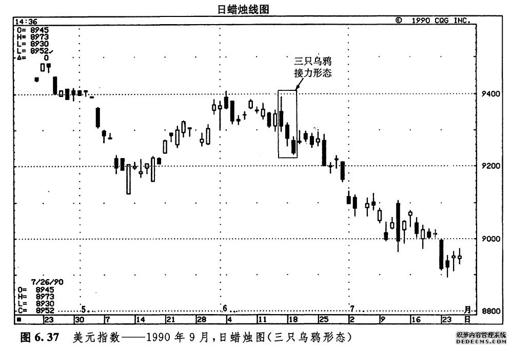 如图6.36所示,是一个典型的三只乌鸦形态的实例。6月中旬,飞来了三只乌鸦。一个月以后,即7月中旬,又出现了另一个三只乌鸦形态。7月的三只乌鸦同时也是市场对6月的三只乌鸦的最高点的试探,这次试探以失败而告终。这个高点的水平大约为33000点。这样,就形成了一个双重顶形态。如图6.37所示,也是一个三只乌鸦形态的实例。6月15日是三只乌鸦中的第一只。这三只乌鸦有个很有意思的地方,第二根黑色蜡烛线和第三根黑色蜡烛线的开市价均分别处在前一根黑色蜡烛线的收市价的水平上,或者与之非常接近。这种情况就称为三只乌鸦接力形态。人们认为这种形态特别疲软,不过,这是一种非常罕见的形态。