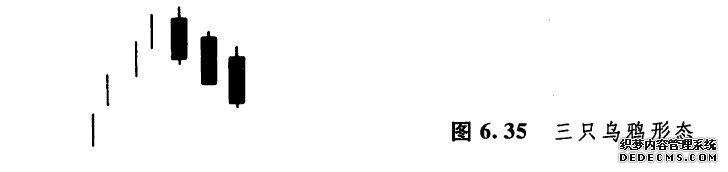 在向上跳空二只乌鸦形态中,包含了两根黑色蜡烛线。如果在类似的形态中,连续出现了三根依次下降的黑色蜡烛线,则构成了所谓的三只乌鸦形态(图6.35所示)。如果三只乌鸦形态出现在高价格水平上,或者出现在经历了充分发展的上涨行情中,就预示着价格即将下跌。有的时候,三只乌鸦形态又称作三翅乌鸦形态。日本有句俗语:“好事不出门,坏事长翅膀”。拿这句话来形容这种“三只翅膀”的乌鸦,那是再恰当不过了。正如该形态的名称所示,三只乌鸦指的就是这三根黑色的蜡烛线。这三根黑色蜡烛线勾勒出了这么一幅不祥的景像:一群乌鸦栖落在一棵枯朽的大树上。因此,三只乌鸦形态具有看跌的意味。从外形上说,这三根黑色蜡烛线的收市价都应当处于其最低点,或者接近其最低点;每根黑色蜡烛线的开市价也都应该处于前一个实体的范围之内。另外,分析者可能还希望“三只乌鸦”中的第一根黑色蜡烛线的实体,居于它之前的那根白色蜡烛线的最高点以下。