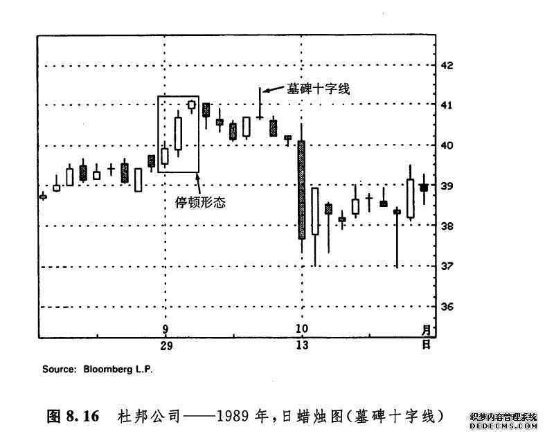 如图8.15所示,4月11日和12日是两根十字线,其中第二根十字线最引人注目。这是一根基碑十字线。在本实例中,这根墓碑十字线标志着熊方已经夺得了主动权,牛方的战争就此完事,随后,图示的上升趋势支撑线被向下突破(关于蜡烛图与趋势线的关系问题,我们在第十一章将要深入探讨)。在图8.16中,10月8日是一根基碑十字线(该蜡烛线的下影线极短,因此依然属于基碑十字线)。对于图示的股票市场来说,这根基碑十字线的技术意义特别疲软。当日,市场曾经向上触及了一个新高位。牛方本来可以乘此良机将价格推高,但是他们却失败了。到当日收市时,价格已经向下回落到了接近当日最低点的地方。在此处的41美元的水平上,市场过去也遇到过麻烦。从9月29日开始,连续出现了三根白色蜡烛线,形成了一个停顿形态。现在,这根基碑十字线再度证实,在41美元的水平上存在着大量的供给。