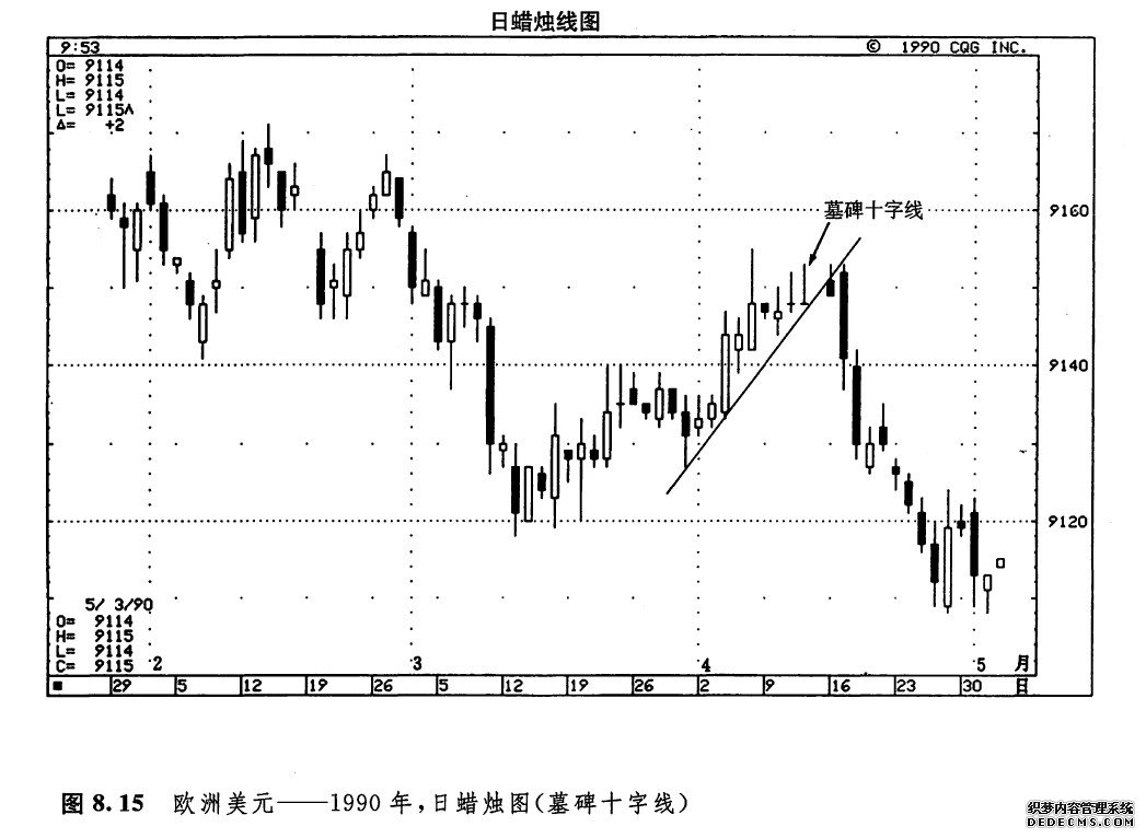 还有一种非常独特的十字蜡烛线,称为基碑十字线(也称灵位十字线)。在某根蜡烛线上,当开市价和收市价都位于当日的最低点时,就形成了一根基碑十字线。虽然我们有时也能够在市场底部发现这类蜡烛线,不过,这类形态最突出的长处还是在于昭示市场顶部方面。从基碑十字线的外形看,它的名称是颇为贴切的。我们曾经指出,日本技术分析的很多术语都建立在类似的军事术语之上,从这个意义上说,基碑十字线恰恰标志着在市场上为捍卫自己的阵地而战死的多头或者空头的墓地。