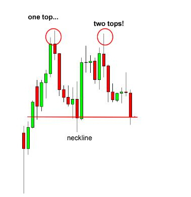 在上图中,你能看到,价格在经历一轮强势上攻行情后形成两个顶峰或双顶。