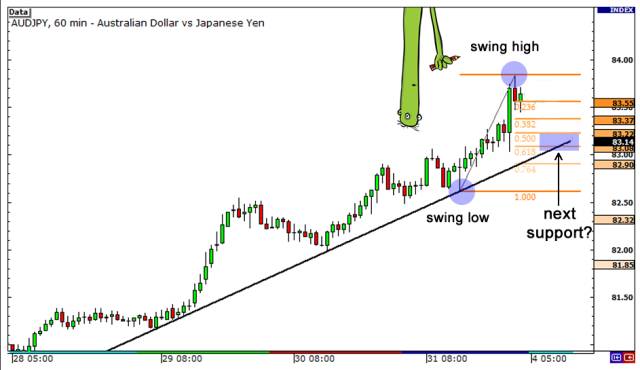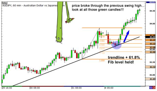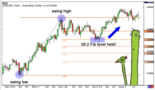你猜到了吗?澳元/日元在61.8%的斐波那契回撤位持稳,汇价在该位反弹后再次走高。如果你在该位设定一些订单,你将找到完美的入场点。