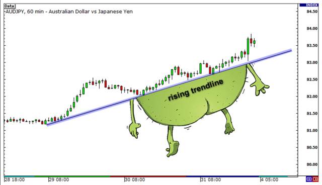 你心里开始嘀咕,“嗯,这条上升趋势线支撑效果不错。我打算买入澳元/日元,哪怕这只是一次短期交易。我认为,我将在汇价再次测试该趋势线时买入。”
