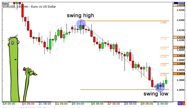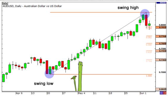 为了将斐波那契水平位在你的图形上展现出来,你首先需要确定摆动高点和摆动低点。