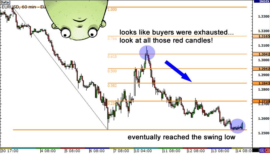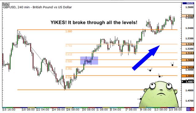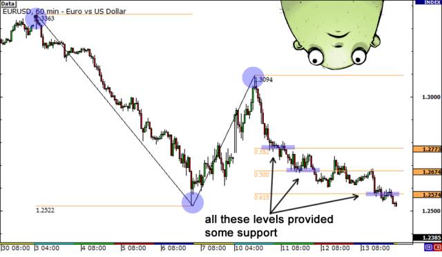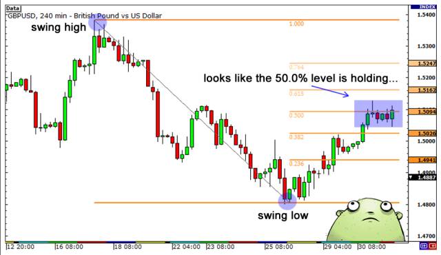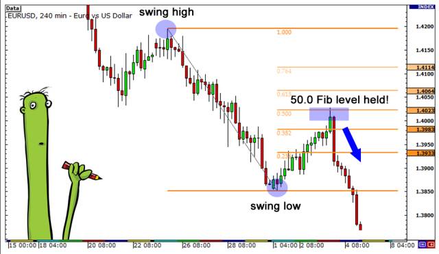 于是,你开始对自己说,“非常好,汇价已经在50.0%的回撤位水平持稳,现在是时候放空了!”