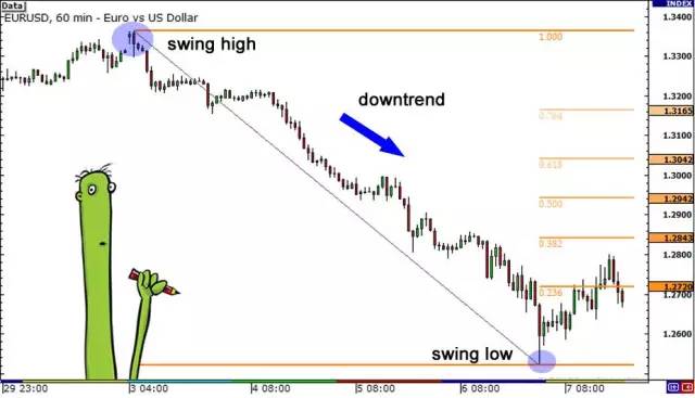 为了找到这些回撤位,你首先必须找到最近的波段高点和波段低点。然后,对于下跌趋势来说,选择斐波那契画图工具,用鼠标点击近期波段高点,并拖动鼠标至最近的波段低点。