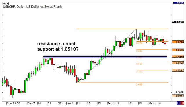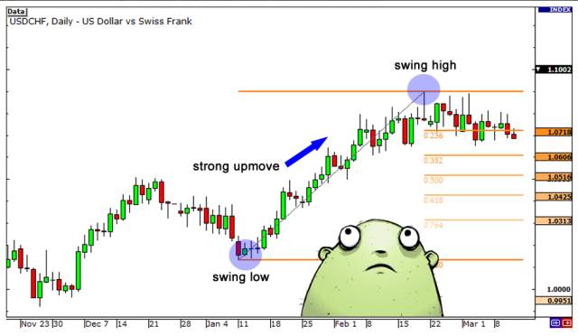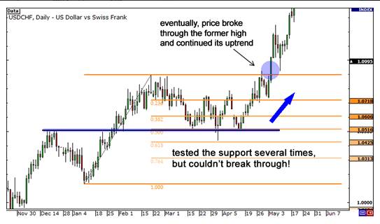 让我们看看,如何结合斐波那契水平位和支撑阻力位使用的例子。下图是美元/瑞郎日图: