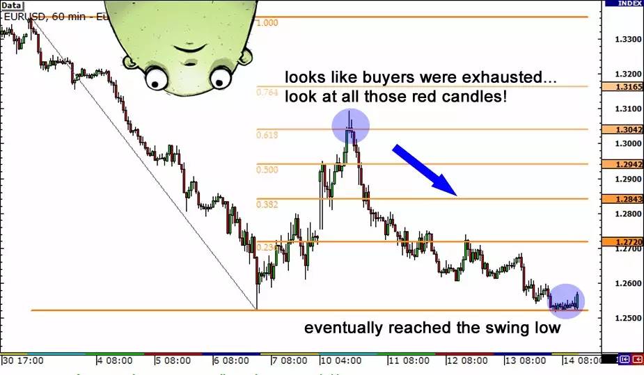 在选择斐波那契工具和蜡烛形态结合使用时,我们会选择实际上看上去动能已经耗竭的蜡烛线。如果你能够识别买入或卖出压力在何已经衰竭,那么斐波那契工具将给你提供价格将在什么时候维持趋势行情的线索。