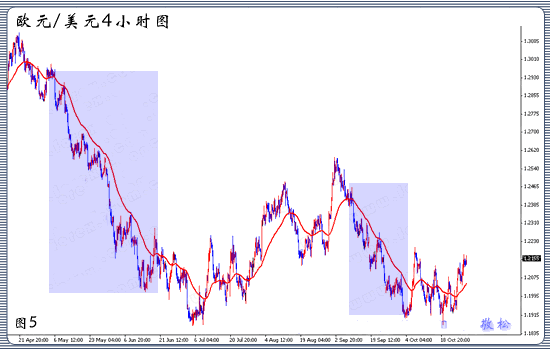 这幅图则是4小时图上的参数为55的指数均线,在图片当中的蓝色举行方框内的单边走势过程中,此均线起到了显著的持续压制效果,直到该均线被反向突破一次之后,欧元的下跌力度才出现了逐渐的缓解。