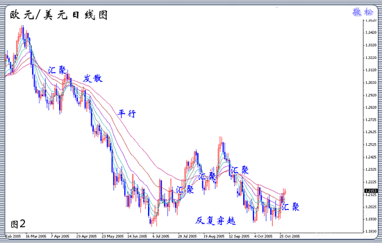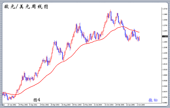 所谓特殊均线是指在特定阶段能起到明显多空分水岭的均线,一般来说我们将其运用于单边市的主趋势中。比如下图:欧元/美元周线图,其中55周指数均线就体现出特殊的多空分水岭效果。