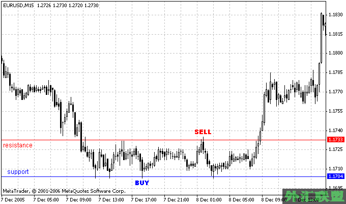 - 在通道里交易是指根据阻力线和支撑线确定交易的趋势,线是指通道的边界。这种策略对横向走势非常有用,但对上升走势和下降走势几乎没用。在通道里交易如下图所示: