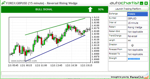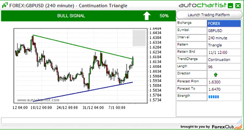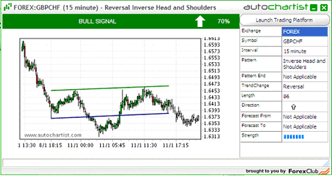 在Autochartist的例子中,信号监测软件显示牛市信号出现的可能性有70%。在这种情况下,当价格越过绿色的颈线,就会出现预期中的走势了。