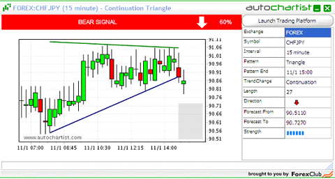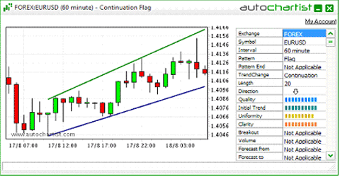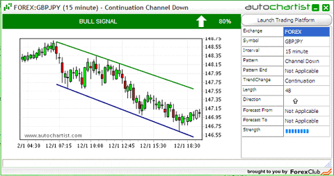 在上方Autochartist的例子中,我们看到的是“下行通道”形态。根据Autochartist的情绪指标所示,上行突破行情将在汇价打破阻力线时出现。