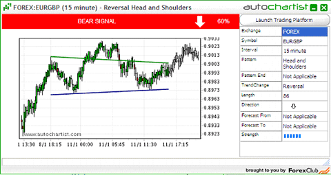 在上方的Autochartist截图中,颈线是以蓝色表示的。此例中,Autochartist预估汇价将会移动到颈线下的机会很大,因此将会出现熊市逆转行情。