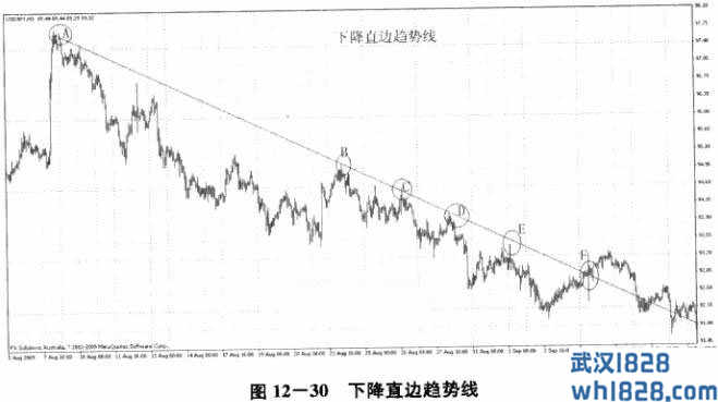 下降直线趋势线如图12-30所示,在a点和b点描绘下降直线。 汇率回到下降的直线时(重要的是看k线反转的形态),传统的反弹出现的汇率突破这条趋势线时,上升趋势暂时告一段落。