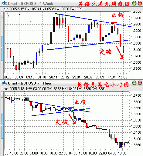 在这次英镑兑美元的下跌过程中,不仅周线图上出现了突破信号,小时图上也出现了一个三角形整理下跌的突破信号,所以我们可以通过小时图上的信号进场作空英镑兑美元,而止损位置设立在小时图上的三角形整理区间的上方。因为依据小时图形在设立的止损位比用周线图设立的止损位置更加精细,这样就可以降低我们做单失误后的风险。