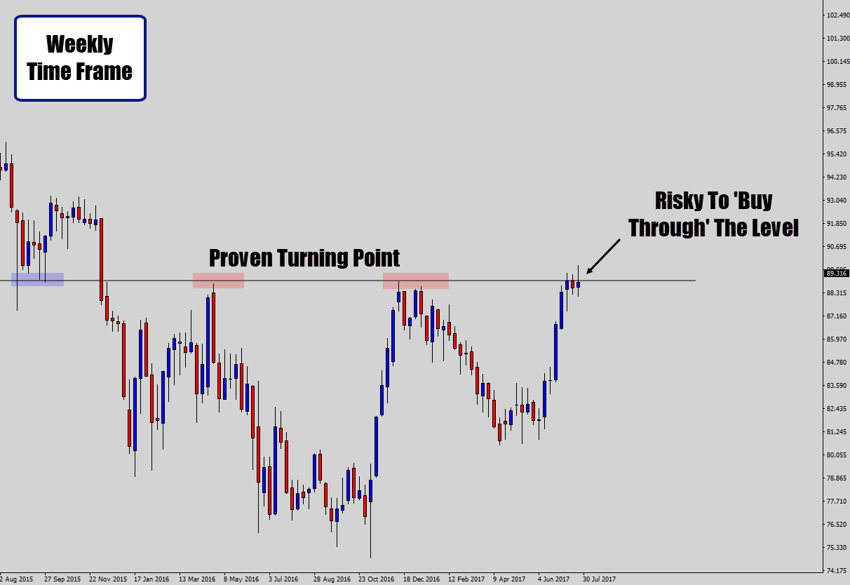 在周图中,我们更容易找到主要的支撑/阻力位,而这是我们在自己交易时段图上很容易忽略的。自上而下的方法在逆势交易中尤其有用。