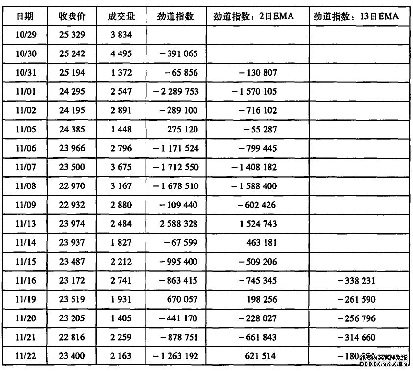 劲道指数的13日EMA跟踪多空双方劲道的长期变化。当它上穿其中线时,表明多方占主导,当它转负肘,表明空方占主导。劲道指数的13日EMA线与价格的背离析、明这是重要的转折点。