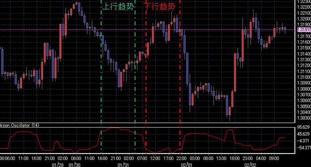 1.当阿隆指标的数值为正数时,代表了上行趋势; 当阿隆指标的数值为负数时,代表了下行趋势。2.当阿隆指标的绝对值接近零的时候,代表了趋势很强。注意: 当数值接近零和线时,代表了趋势不明显。
