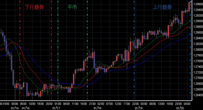1.当蓝,红和绿线互相交缠时,代表了目前市场状况平淡。鳄鱼正处於沉睡状态。沉睡的时间越长,市场越有可能会出现变化。2.当蓝,红和绿线分开,并且价格处於鳄鱼嘴巴的上方时,代表了市场处於上行趋势。鳄鱼已觉醒并开始猎食。3.当蓝,红和绿线分开,并且价格处於鳄鱼嘴巴的下方时,代表了市场处於下行趋势。鳄鱼已觉醒并开始猎食。4.当蓝,红和绿线重新互相交缠时,代表了目前市场状况回復平淡。鳄鱼已经饱足,也是锁定获利的时候。