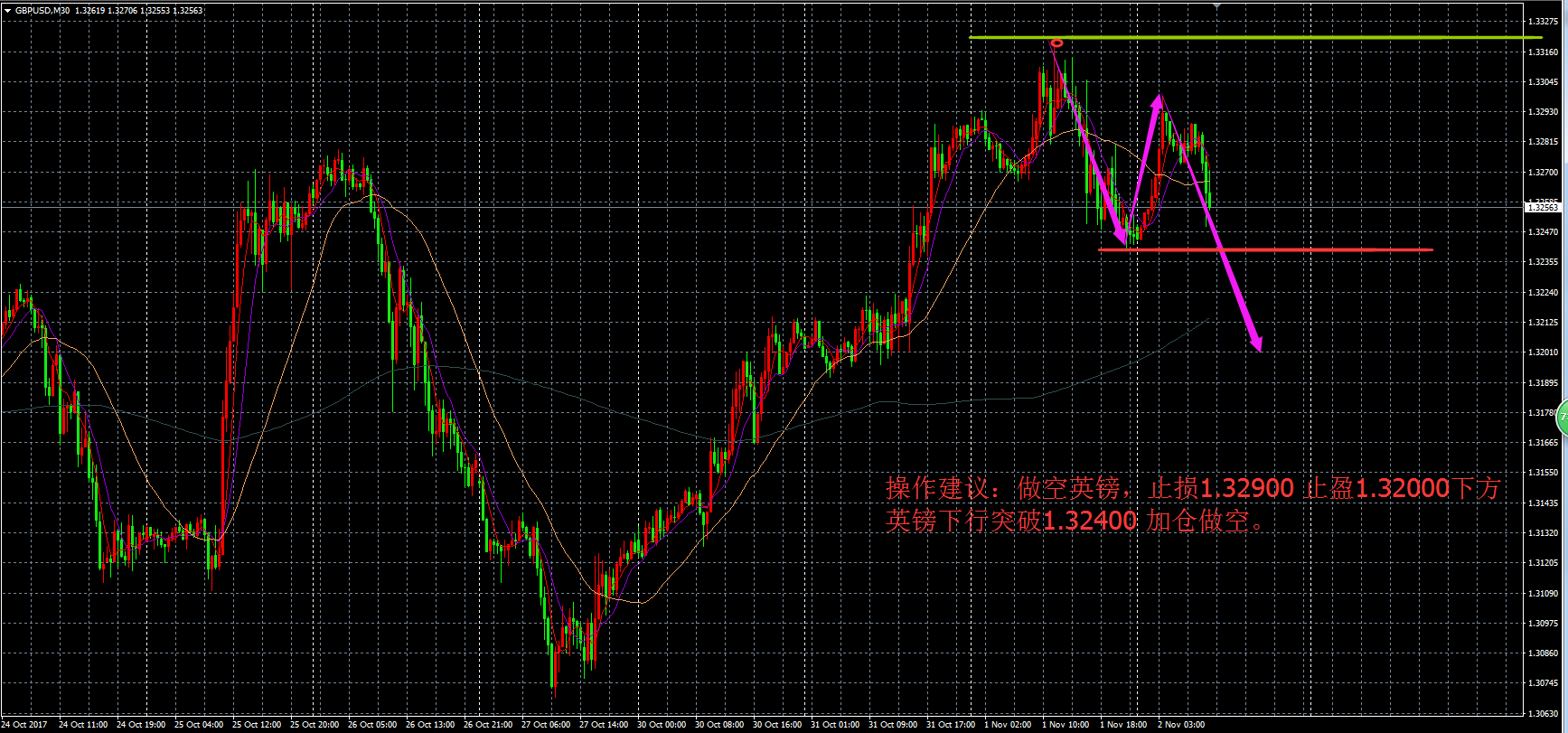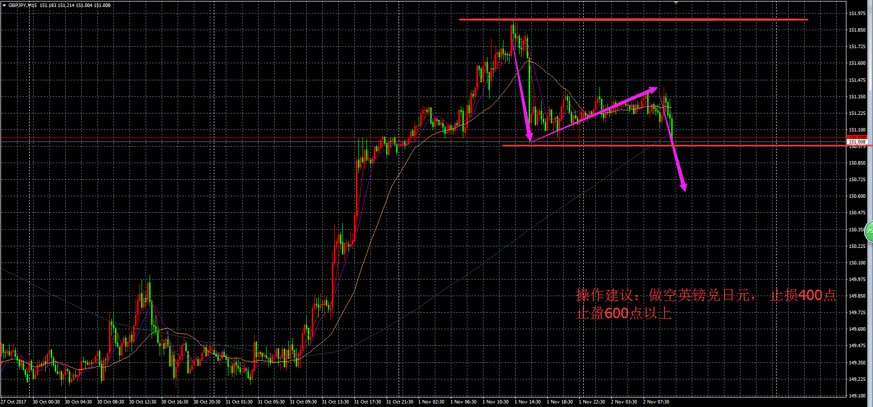 由于当日公布英国央行利率决定,20:00公布数据之后,英镑/日元 瞬间暴跌,日内下跌达到2600点。客户空单英镑/日元获利 130点,分析师目标止损400点,止盈600以上点