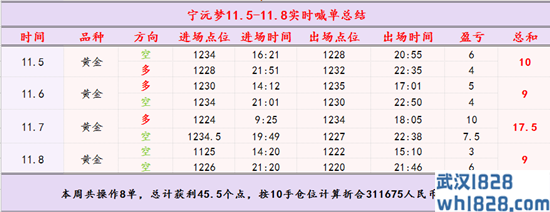 这周总结:接近本周尾声,美指表现强势,黄金从整体表现上来看基本震荡走弱,因此高点做空是对我们来说是安全的选择,本周共操作8单,总计获利45.5个点,按10手仓位计算折合311675人民币。你跟上了吗?