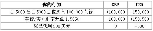 3、你的预计变为现实,你打算卖出英镑/美元。你在1.5050平仓,那么,你大约盈利500美元。
