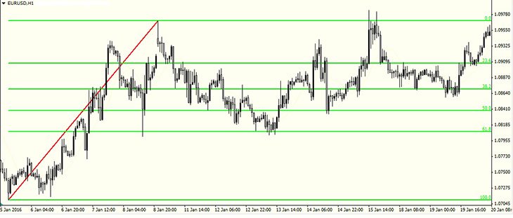 在任意一个终端都有«斐波纳奇线», 通过其可以创建回调水平 -– 0%, 23,6%, 38.2%, 50%, 61.8%, 76,4% 和 100%. 斐波纳奇线还可以确定回调目标, 如果趋势继续 - 161.8%, 261.8% 和 423.6%.