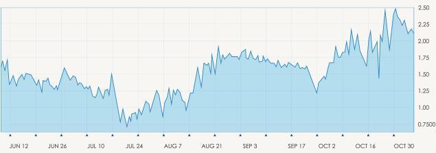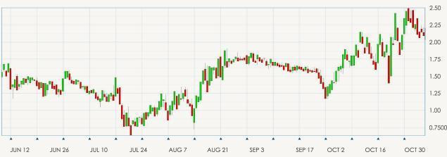 开盘价是位于垂直柱条左侧的破折号,而收盘价反之,以一根相似的水平线代表,不过是在垂直柱条右侧。这种图表非常容易理解,如果左侧破折号(开盘价)低于右侧破折号(收盘价),则柱子将是绿色、黑色或蓝色阳线,代表着价格上涨、工具升值。反之亦然,股票价值下降以红色表示。