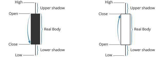 每家经纪商的K线实体的颜色各不相同,可能是绿色或蓝色代表着价格上升,或者红色代表价格下跌,或者中空的K线代表收盘价高于开盘价,表明投资者买进。填充/有颜色的K线代表收盘价低于开盘价,将提示沽出头寸。
