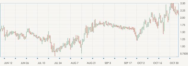 柱状图 – 是对折线图的补充,在曲线图表上的每个数据点上,再加入几个信息的关键成分。柱状图由一系列垂直线构成,每根线描绘出交易信息,即交易期间内的高低点、开收盘价。开收盘价以较短的水平线条构成。