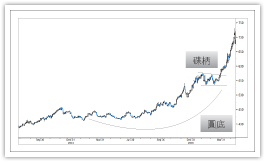 由2005 年2 月中至2006 年月2 月,金价反复上落,形成了一个圆形的底部,即为「圆底」。至2006 月1 至3 月,金价有上升的迹象,同期亦形成「碟柄」形势,为大升展开序幕。