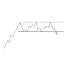长方形 长方形的形成,亦是因为好淡争持不休,互不相让的结果。以右图为例,价格攀升至高位后回吐,但每到一定低位便获支持,但升达一定高位又再被沽货。价格反复波动,于是出现了两条平衡的支持线和阻力线。此时,若价格跌破支持线,价格将急剧下挫,价格目标为长方形的高度。 |