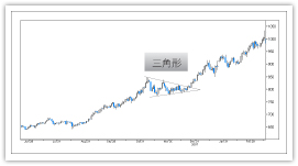 金价由2007 年7 月中开始上升,由650 美元上升至850 美元。不过,2007 年11月初至12 月底,金价明显进入一个三角形的整固形势。金价于三角形内上下波动,至成功突破三角形走势,金价再度拾级而上。