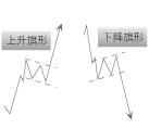 旗形 旗形由旗竿及旗身组成,可分为上升旗形及下降旗形。旗形形成的原因,是因为价格经过大幅上升或大幅下降后,被市场获利回吐或作空头回补。价格经过消化后,会再度延续其升势或跌势。突破后价格目标,是价格进入旗形走势前的升幅或跌幅。 |