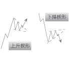 楔形 楔形是三角形及旗形的结合,可分为上升楔形及下降楔形,应用方法亦跟两者差不多,都是于突破位,跟随突破方向买卖。突破后价格目标,是价格进入楔形走势前的升幅或跌幅。 |