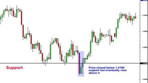 这个问题并没有绝对的答案。下面我们以支撑位为例,一些交易者认为如果市场收盘价低于某一支撑位就表明该支撑位被突破了,可是我们发现这并不一定准确,请看下面图中的例子。下图中,我们看到收盘价已经突破了1.4700支撑位,但是最终又回升到该支撑位之上。如果我们此时判定市场已经真正突破了该支撑位,我们做空此货币对,我们将损失惨重!