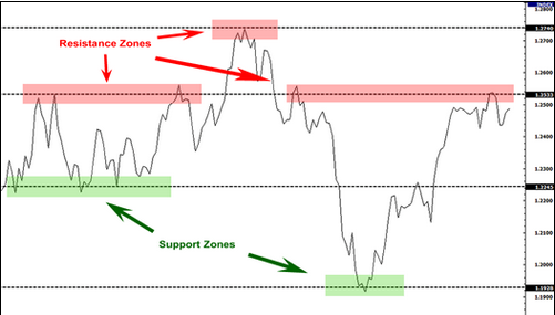 请看下面的图表,合理的支撑区域或阻力区域通常都是某个形成过多次峰值或谷值的价格水平附近的区域。