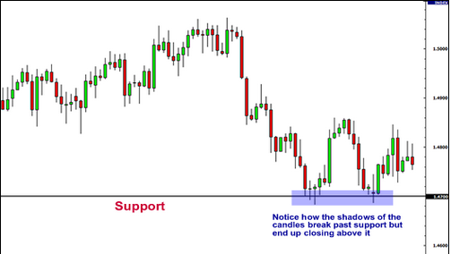 很重要的一点需要大家记住,支撑位与阻力位并不是精确的数字,通常,把支撑位与阻力位看成一个区域会更加合理。我们经常看到某个支撑或者阻力位被突破了,但很快我们发现市场只是进行了测试而已。从蜡烛图上看,市场测试通常表现为蜡烛图的“影线”(shadows)突破(击穿)这些支撑位与阻力位。