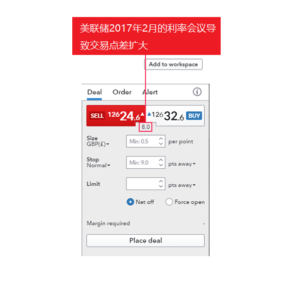 通过上图我们可以看到IG在2月份美联储利率会议时提供的买入价和卖出价的点差。注意这时的点差会比平时高出许多,而交易者则不得不在市场恢复正常前承担更多的交易成本。